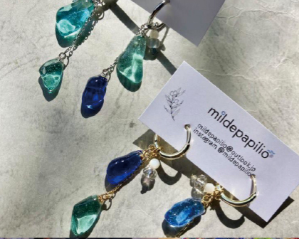 海に流れついたガラスや陶器の欠片を集め、 アクセサリーを制作しています。 いつの時代、 どこから流れてきたものなのかとロマンを感じ、 想像を膨らませながら、 ひとつとして同じ形のない一点物の作品に仕上げています。
