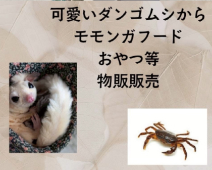 今回初出店!モモンガ用おやつから、 手作リフードや用品等や可愛いダンゴムシや小さな淡水カ二を是非見に来てください!